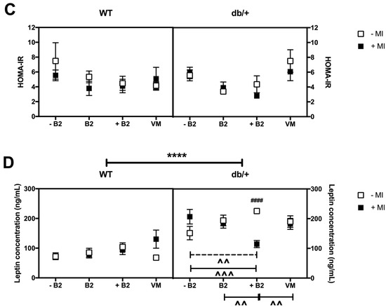 No changes were observed in: (A) fsting glucose; (B) fasting insulin; (C) HOMA-IR index at GD18.5; and (D) fasting plasma leptin at GD18.5. * indicates a main effect; # indicates a difference between groups with and without MI; and ^ indicates a difference between vitamin status groups, where a dashed line indicates the difference occurs in the group without MI, and a solid line indicates that the difference occurs in the group with MI. db/+ mice had higher fasting plasma leptin concentrations than WT mice, as indicated by **** (p < 0.0001). There was a significant effect of MI supplementation in db/+ mice on supplemented B2, as indicated by #### (p < 0.0001). There was also a significant difference between mice on supplemented B2 and the suboptimal B2 group, in the absence of MI—indicated by ^^ (p = 0.007). The opposite effect was observed in the presence of MI—indicated by ^^^ (p = 0.001). Mice in the supplemented B2 group also had lower leptin than mice in the normal B2 (p = 0.014) and vitamin mix (p = 0.010) groups in the presence of MI—indicated by the ^^ under the graph. n = 7–12 mice per group.