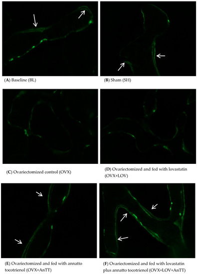 Micrograph of calcein-labeled trabecular bone. Rats treated with annatto tocotrienol alone or in combination with statin showed more calcein double-labeled surface. The white arrows show double-labeled surface.