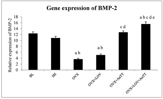 Gene expression of BMP-2 among the study groups. Legend: Letters indicates significant difference between the marked group and ‘a’ BL; ‘b’ SH; ‘c’ OVX+LOV’; ‘d’ OVX+AnTT or ‘e’ OVX+LOV+AnTT. Abbreviation: BL = baseline; SH = sham-operated; OVX = ovariectomized; OVX+LOV = ovariectomized and supplemented with lovastatin (11 mg/day); OVX+AnTT = ovariectomized and supplemented with annatto tocotrienol (60 mg/kg/day); OVX+LOVAnTT = ovariectomized and supplemented with lovastatin (11 mg/day) and annatto tocotrienol (60 mg/kg/day).