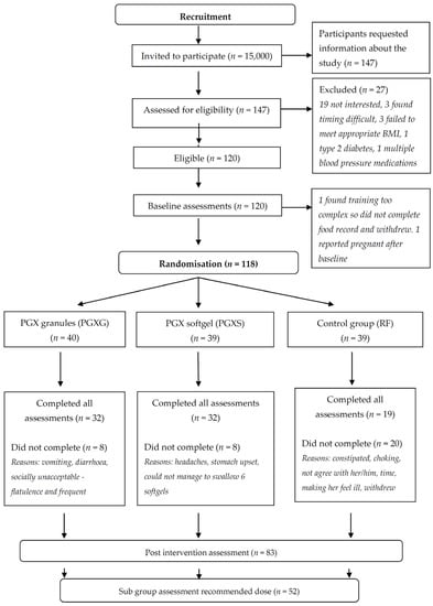 A three-arm, parallel, blind, randomised control trial was conducted to determine whether PGX supplementation would promote weight loss and reduce waist circumference and BMI, change dietary patterns and reduce the frequency of eating or number of eating occasions. Participants (118 in total) were divided between three groups, 4.5 g PGX as softgels (PGXS), 5 g PGX granules (PGXG) and 5 g rice flour (RF) control, (Figure 1) and were assessed at baseline and 12 weeks. This trial was registered with the Australian New Zealand Clinical Trials Registry (reference ACTRN12614000701628).