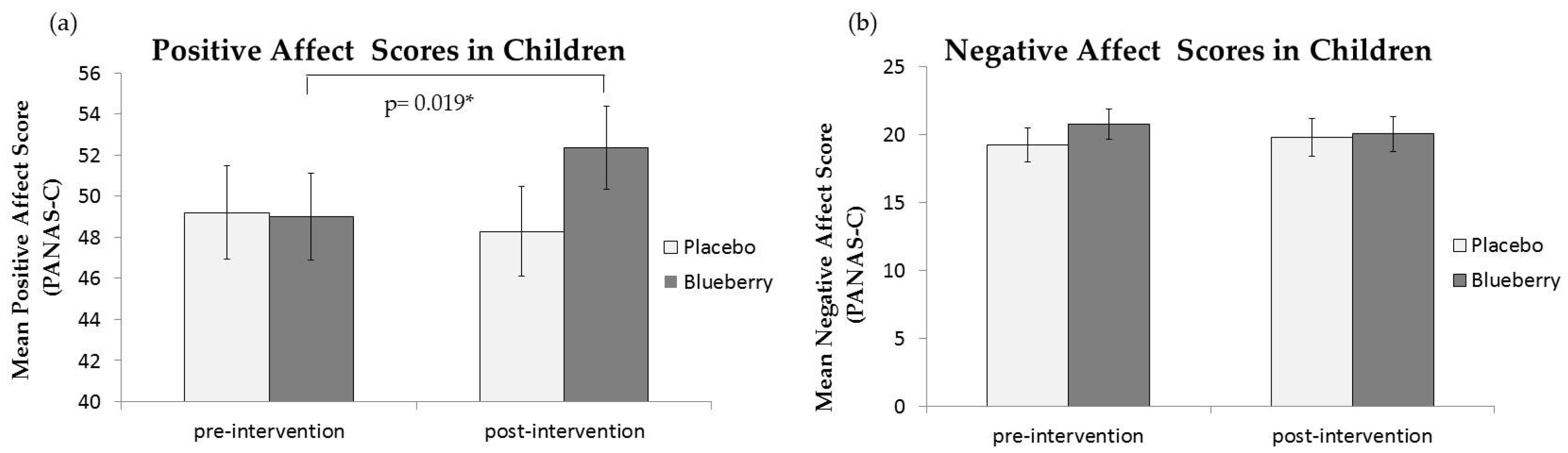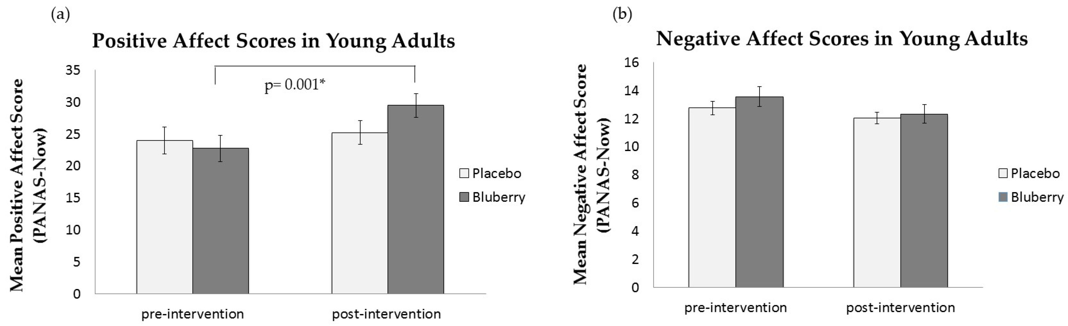 This study demonstrated acute effects of blueberry flavonoid consumption on Positive Affect and no effect on Negative Affect in healthy children and young adults. Dietary interventions could play a key role in promoting positive mood and are a possible way to prevent dysphoria and depression. Given the potential implications of these findings for preventing depression, a disabling and common mental health problem in adolescents and adults, it is important to replicate the study and assess the potential to translate these findings to practical, cost-effective and acceptable interventions.