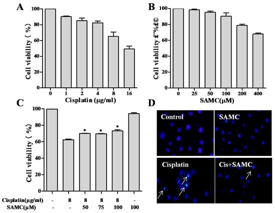 S-allylmercaptocysteine (SAMC) attenuated cisplatin-induced cytotoxicity in human kidney (HK-2) cells. Cell viability was assessed using the SRB (sulphorhodamine B) assay. HK-2 cells were treated with various concentrations of cisplatin (A), SAMC (B), Cells were pretreated with or without SAMC (50–100 μM) for 4 h and then cultured in the presence or absence of 8 μg/mL cisplatin for 24 h (C,D) HK-2 cells treated with 8 μg/mL cisplatin and 8 μg/mL cisplatin plus 100 μM SAMC were stained with DAPI (4’6-diamidino-2-phenylindole) to investigate apoptotic-like nuclear morphology. White arrows indicate condensed nuclei. All data were obtained from three independent experiments and presented as the means ± SEM (standard error of the mean). Bars with different characters are statistically different at * p < 0.05 level.