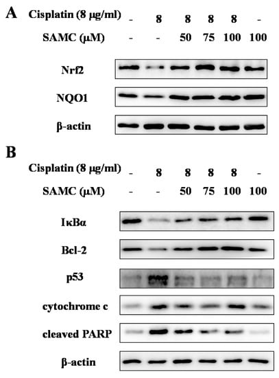 Effects of SAMC on nuclear factor erythroid 2-related factor 2 (Nrf2) and NAD(P)H:quinone oxidoreductase 1 (NQO1) expression (A); NF-κB activity and the expression of apoptosis-related proteins (B) in HK-2 cells. Cells were pretreated with or without SAMC (50–100 μM) for 4 h and then cultured in the presence or absence of 8 μg/mL cisplatin for 24 h. The expression levels of Nrf2, NQO1, IκBα, Bcl-2, p53, cytochrome c and cleaved PARP (poly ADP ribose polymerase) were analyzed by Western blot. Equal protein loading was confirmed by analysis of β-actin in the protein extracts.