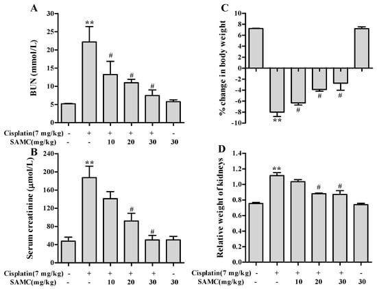 Effect of SAMC on cisplatin-induced changes in serum renal function parameters. (A) Blood urea nitrogen (BUN); (B) Creatinine; (C) Percentage change in body weight and (D) Relative weight of kidneys in different experimental groups. SAMC was administered intraperitoneally at three different doses i.e., 10 mg/kg, 20 mg/kg and 30 mg/kg for 20 consecutive days and a single dose of cisplatin (7 mg/kg, intraperitoneally) was administered on the 15th day. On the 20th day, serum levels of BUN and creatinine, percentage change in body weight and relative weight of kidneys were recorded. Values are expressed as mean ± SEM (n = 6). ** p< 0.01 vs. control, # p< 0.05 vs. cisplatin.