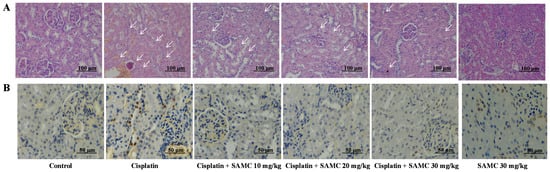 Effect of SAMC on renal histology (A) and tubular apoptosis (B) in cisplatin-induced renal injury in rats. White arrows show tubular damage.