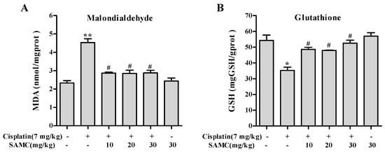 Effect of SAMC on cisplatin-induced changes in oxidative stress markers in renal tissues of rats. (A) Malondialdehyde; (B) Glutathione. SAMC was administered intraperitoneally at three different doses, i.e., 10 mg/kg, 20 mg/kg and 30 mg/kg for 20 consecutive days and a single dose of cisplatin (7 mg/kg, i.p) was administered on the 15th day. Values are expressed as mean ± SEM (n = 6). * p < 0.05 vs. control, ** p < 0.01 vs. control, # p < 0.05 vs. cisplatin.