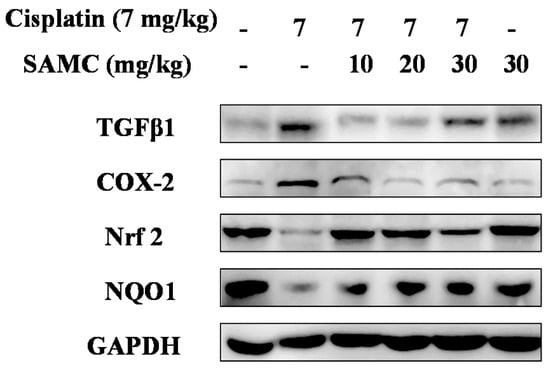 Effect of SAMC on cisplatin-induced changes on the expression of proteins in renal tissues of rats. SAMC was administered intraperitoneally at three different doses, i.e., 10 mg/kg, 20 mg/kg and 30 mg/kg for 20 consecutive days and a single dose of cisplatin (7 mg/kg, i.p) was administered on the 15th day. The expression levels of transforming growth factor-β (TGFβ1), cyclooxygenase-2 (COX-2), Nrf2 and NQO1 were analyzed by Western blot. Equal protein loading was confirmed by analysis of GAPDH (glyceraldehyde 3-phosphate dehydrogenase) in the protein extracts.