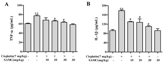 Effect of SAMC on the levels of renal inflammatory cytokines in cisplatin-induced nephrotoxicity. SAMC was administered intraperitoneally at three different doses, i.e., 10 mg/kg, 20 mg/kg and 30 mg/kg for 20 consecutive days and a single dose of cisplatin (7 mg/kg, i.p) was administered on the 15th day. On 20th day, serum levels of tumor necrosis factor (TNF)-α (A) and interleukin (IL)-1β (B) were recorded. Values are expressed as mean ± SEM (n = 6). ** p < 0.01 vs. control, # p < 0.05 vs. cisplatin.