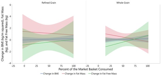 Changes in Body Composition with Percent Consumption of the Market Baskets. No significant differences were found using analysis of variance in the change of BMI (RG p = 0.494, WG p = 0.658), fat mass (RG p = 0.962, WG p = 0.372), or fat free mass (RG p = 0.823, WG p = 0.561) from baseline to post intervention.