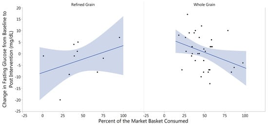 Percent of Market Basket Consumed Related to Change in Fasting Glucose. Increased consumption of the whole grain market basket was related to lower (p = 0.053) fasting blood glucose in the whole grain treatment, whereas there was a pattern of increased blood glucose with increased consumption of the refined grain market basket (p = 0.590).