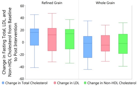Consumption of the Whole or Refined Grain Market Basket Related to Change in Fasting Total, LDL, and Non-HDL Cholesterol. Consumption of the WG market basket was significantly associated with lower fasting levels of total cholesterol (p = 0.018), LDL cholesterol (p = 0.035), and non-HDL cholesterol (p = 0.047) when compared to subjects that consumed the RG market basket.