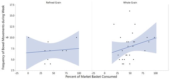 While there was no difference in average bowel movement frequency across the six-week intervention, there was there a significant difference in frequency with relation to percent of the whole grain market basket consumed when looking at only the sixth week of intervention. Bowel movement frequency increased significantly with increased whole grain consumption in Week 6 while there was only a slight, non-significant increase in the refined grain intervention. Whole grains have been shown to decrease intestinal transit time, thereby increasing bowel movement frequency [8,41,65,66]. In a recent review of 65 intervention studies, it was found that intake of wheat fiber, such as is found in wheat bran, a component of whole grain wheat, was shown to decrease transit time by about 45 min per gram of wheat fiber consumed, if the initial transit time was more than 48 h [67]. In a meta-analysis of 65 intervention studies utilizing cereal fibers from wheat, rye, corn, oats, barley, sorghum, and rice, investigators reported that, if the initial transit time was more than 48 h, cereal fiber reduced transit time by 30 min per gram consumed [68]. The mechanism for this is generally thought to be fecal bulking due to the increased fiber from increasing whole grain intake causing water retention in the feces which improves transit time [8,69]. Consuming whole grain barley has been shown to increase average fecal weight compared to the stool weight of refined grain consumers [65] and consumption of a high fiber cereal made of wheat, corn, oats, and soybeans was shown to increase bowel movement frequency compared to a similar low fiber cereal in humans [70]. It must be noted that bowel movement frequency was self-reported in our study and was not measured pre-intervention at baseline. There was also a trend towards increased bowel movement frequency observed in the refined grain intervention, thus the validity of the increase should be interpreted with caution.