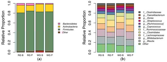 Relative proportion of taxa in each experimental group. The relative proportion of taxa at baseline (B) and post intervention (P) for the refined grain (RG) and whole (WG) treatments: (a) the relative proportion of bacteria at the phylum level; and (b) the relative abundance of bacteria at the most specific level of classification available. In both panels, taxa present at a median of 1% relative abundance in the data set are shown. Taxa present at lower than 1% median relative abundance are grouped into the “Other” category.