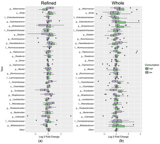 Variation in specific taxa during market basket consumption. Log2 fold change in abundance of bacteria at either high (50% or more) or low (49.99% or less) levels of consumption of the market baskets from baseline to post intervention for: refined grain (a); and whole grain (b). Taxa shown were present in at least 2% relative abundance in at least one sample. Dots seen in the graphs represent outliers. The findings of interest were an increase in the relative abundance of Akkermansia and Lactobacillus with high whole grain market basket consumption and a decrease with high refined grain consumption, as well as the increased abundance of the order Erysipelotrichales (p = 0.023) with high refined grain consumption.