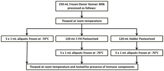 Fifty samples (250 mL) of frozen anonymous DHM were obtained from a HMB. As per standard regulations, donors were healthy, HIV negative women who were screened for absence of any lifestyle risks and donated breastmilk is stored frozen for a maximum period of three months from date of expression. Donor human milk samples were processed according to Figure 1. Therefore, from each donor human milk sample there were three sets of aliquots: unpasteurized human milk; human milk pasteurized by holder pasteurization using the Sterifeed pasteurizer and human milk pasteurized using the flash-heat (F-FH) method, monitored using the FoneAstra pasteurization system. Unpasteurized samples will be referred to as “Control” samples throughout the remainder of this document, while “F-FH” and “Holder” represent the FoneAstra flash-heated samples and Sterifeed-Holder pasteurized samples, respectively. Cytokine and antibody assays were performed in the Department of Paediatrics and Child Health at the University of KwaZulu-Natal. Lysozyme and lactoferrin activity assays were performed in the Department of Microbiology at the University of KwaZulu-Natal. Samples were assayed between one and 18 months after pasteurization; however, controls and pasteurized samples were always processed together for each variable tested.