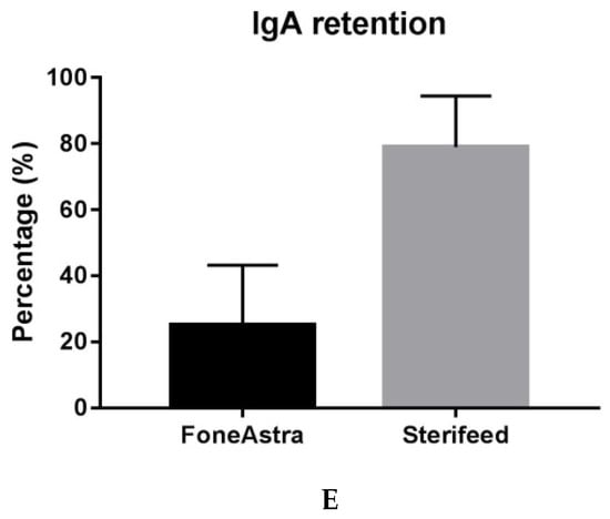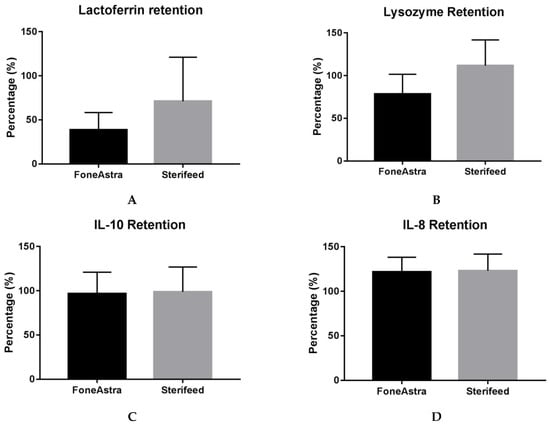 Immune factor concentrations are not normally distributed; therefore, a nonparametric test for paired samples was used to test the significance of these data. Differences between group pairs were analyzed with a Student’s t-test, using a Wilcoxon signed rank post-test. When comparing the percentage retention of immune factors, a Student’s t-test with a Mann-Whitney post-test was used. Outliers were identified and removed from the analysis using the Rout method, establishing a maximum false discovery rate (FDR) of 1% (Q = 1). All analyses were performed using GraphPad Prism version 7 (GraphPad Software, San Diego, CA, USA). Data in bar graphs are presented as means ± Standard Deviation (SD). Findings were assumed statistically significant at p < 0.05. The value of the controls was considered to be 100%; therefore, the concentration of cytokines and antibody and the amount of lysozyme and lactoferrin activity were expressed as a percentage of the control sample.
