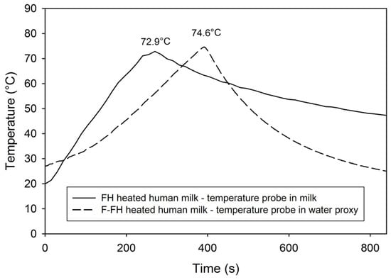 Although the previous FH study did not compare effects to another pasteurization method, the disparity in these findings was surprising and suggests that even small differences in temperature thresholds and methodologies are critical. Figure 3 shows the time-temperature curves of the original FH study overlayed with a typical curve from this F-FH study. In the original FH study, the temperature probe was placed in a milk sample, and the peak temperature of the milk reached was 72.9 °C, whereas in the current study the peak temperature reached was most likely higher. A significant limitation of the current study is the lack of milk temperature data to document this; the exact temperature in the milk was not monitored directly—instead, the temperature probe in F-FH was placed in a proxy water bottle where the peak temperatures reached were typically between 74–75 °C. The peak temperature in the milk, resulting from the latent increase in heating even after being removed from the water bath, was therefore likely about 74 °C or potentially higher. After samples were collected for this study and these higher peak temperatures were observed, the FoneAstra temperature threshold was subsequently reduced from 73 °C to 72 °C. Previous studies evaluating the effect of varying the pasteurization temperature showed that even small temperature increments can significantly compromise some immune components [,,,]. Additionally, other factors that differed between the original FH system and the F-FH system, such as the volume of milk pasteurized, the bottle size used and the heat source, would likely have contributed to the differences seen between the outcomes of the two studies.