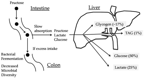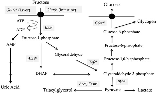Plasma fructose levels (~200 μM in animals and 10–70 μM in humans) are much lower than plasma glucose levels (~6 mM) [6,7]. However, plasma fructose levels are positively correlated with glycemic control [7]. Fructose has more potent cytotoxicity because of increased advanced glycation end product (AGE) production [8,9]. Thus, fructose is not as readily absorbed and is immediately converted into other metabolites, such as glucose, triacylglycerol, and lactate in the intestine and liver [10,11,12]. If excess fructose is consumed, undigested fructose can cause bacterial fermentation, resulting in abdominal pain, flatulence, and diarrhea [13]. Therefore, clarification of the regulatory mechanisms underlying intestinal and hepatic fructose metabolism will be beneficial for understanding the pathogenesis of not only obesity-related diseases, but also fructose malabsorption.