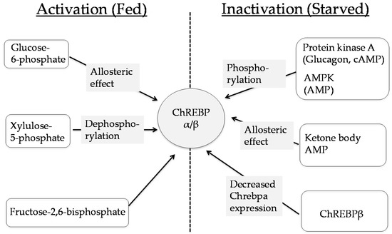 ChREBP is activated by several metabolites, such as glucose-6-phosphate, xylulose-5-phosphate, fructose-2,6-bisphosphate, and Uridine diphosphate N-acetylglucosamine (UDP-GlcNAc), and suppressed by adenosine monophosphate (AMP), ketone bodies and cyclic cAMP [43,44,45,46,47,48,49,50,51,52] (Figure 3).