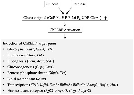 ChREBP has an important role in regulating glucose and lipid metabolism. Glucose and fructose regulate many genes expression through ChREBP activation [14,20,23,24,25]. Glut2, glucose transporter 2; Glut4, glucose transporter 4; Pklr, pyruvate kinase, liver and red blood cell; Glut5, glucose transporter 5; Khk, ketohexokinase; Fasn, fatty acid synthase; Acc1, acetyl coA carboxylase 1; Scd1, stearoyl CoA desaturase; G6pc, glucose-6-phosphatase catalytic subunit; Fbp1, fructose-1,6-bisphosphatase 1; G6pdh, hexose-6-phosphate dehydrogenase; Tkt, transketolase; Mttp, microsomal triglyceride transfer protein; Klf10, kruppel-like factor 10; Klf15, kruppel-like factor 15; BHLHE40, basic helix-loop-helix family, member E40; Bhlhb2, Basic helix-loop-helix domain-containing protein, class B; Hnf1a, hepatocyte nuclear factor 1a; Hif1, hypoxia inducible factor 1; Fgf21, fibroblast growth factor 21; Angptl8, angiopoietin like 8; Gcgr, glucagon receptor; Adipor2, adiponectin receptor 2.