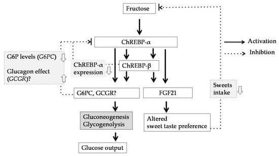 Fructose induces G6pc and Fgf21 gene expression thorugh ChREBP activation. ChREBP-α regulates ChREBP target genes expression. In turn, products of ChREBP target genes (ChREBP-β, G6pc, Gcgr, and Fgf-21) might suppress ChREBP transactivity [20,21,22,67,73]. FGF-21 suppress ChREBP transactivity by decreasing sweets intake [70,71]. GCGR might suppress ChREBP activity by enhancing glucagon effects and thereby protein kinase A activity. G6PC might suppress ChREBP activity by decreasing intracellular G6P levels. G6PC, glucose-6-phosphatase catalytic subunit; GCGR, glucagon receptor; FGF21, fibroblast growth factor-21; G6P, glucose -6-phosphate; ChREBP, carbohydrate response element binding protein.