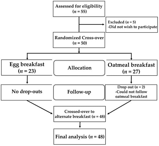 Of the 55 potential participants screened, five were excluded due to a personal decision not to participate. During the first phase of the study, two participants dropped out due to failed compliance while consuming oatmeal; 48 participants completed the study (Figure 1).