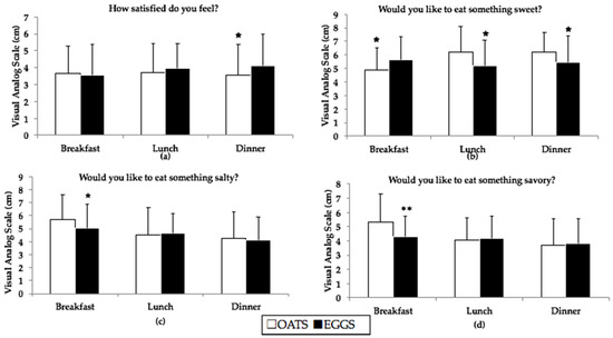 The analysis of VAS revealed that participants consuming eggs for breakfast felt more satisfied prior to consuming dinner than participants consuming oatmeal, suggesting a prolonged effect of egg intake on satiety throughout the day (Figure 2a). Participants consuming eggs felt more of a desire to consume something sweet for breakfast, then less of a desire for something sweet prior to lunch and dinner (Figure 2b). Finally, participants consuming eggs felt less of a desire to consume something salty or savory for breakfast, as compared to participants consuming oatmeal for breakfast (Figure 2c,d).