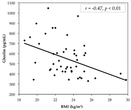 Correlation between fasting plasma ghrelin and body mass index (BMI) following the consumption of two eggs for breakfast; participants (n = 48), r = −0.47, p < 0.01.