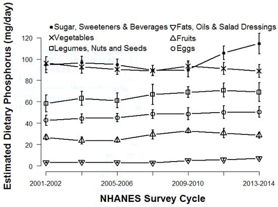 A major limitation of this study is the potential misreporting of phosphorus content by nutrient databases. Indeed, the underestimation of phosphorus content of beverages and meats by nutrition databases has been previously reported [,]. Dependence on self-reported dietary consumption is a limitation of all studies using 24-h dietary recall. However, the USDA Automated Multiple Pass method, used in NHANES since 2002, has been shown to improve standardization across interviewers and enhance participant recall as compared to other methods [,,]. We analyzed trends using linear regression, though the data may not be linear.