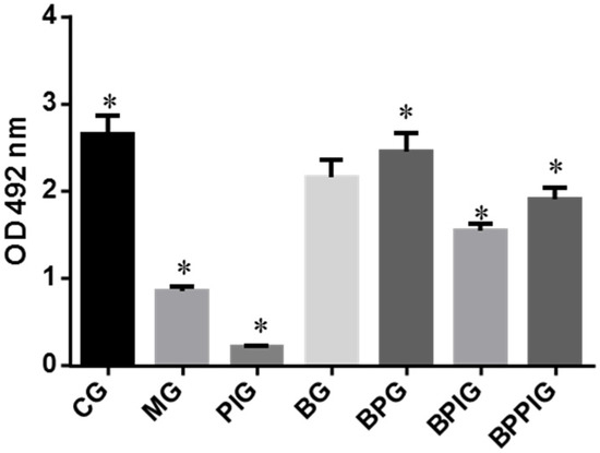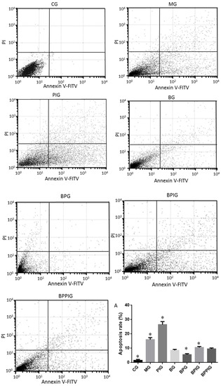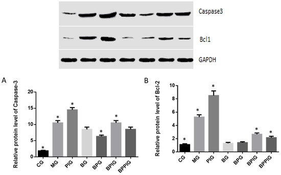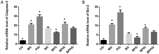 qRT-PCR analysis indicated that the mRNA levels of caspase-3 and Bcl-2 were higher in MG, PIG, BPIG and BPPIG than in CG, BG, and BPG (Figure 9) (p < 0.05). The results suggest that BP treatment reduced the mRNA level of caspase-3 and Bcl-2. After the treatment of PPAR-α inhibitor, the mRNA level of PPAR-α was stable but the mRNA levels of caspase-3 and Bcl-2 were increased, suggesting that the inhibition of PPAR-α activity will increase the mRNA levels of caspase-3 and Bcl-2.