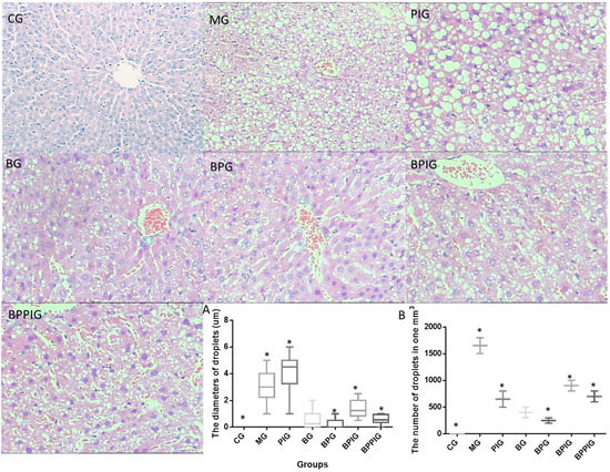 HE analysis for the effects of BP on NASH and liver damage: (A) the diameters of lipid droplets in different groups; and (B) the concentration of lipid droplets in different groups. Eight liver samples were analyzed in each group. All data are presented as mean value ± S.D. * p < 0.05 via a blueberry juice group BG.