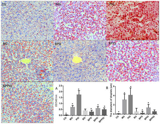 Figure 6 shows the liver tissues stained using ORO from different groups. In CG, the liver tissues were little stained with ORO while the liver tissues were most stained with ORO in PIG. Blueberry juice reduced the staining in animal models and the model treated with GW6471. BP treatment reduced the staining better than only blueberry juice. The absorbing values for ORO showed a similar changing trend in different groups (Figure 6A). The value was highest in PIG and lowest in CG. BP reduced the values in BG, BPG, BPIG and BPPIG. Comparatively, the number and size of droplets were highest in PIG compared to other groups while the number and size of droplets were lowest in CG compared to other groups (Figure 6B). Blueberry juice and/or probiotics treatment reduced the number and size of droplets compared to PIG (Figure 6B, p < 0.05).