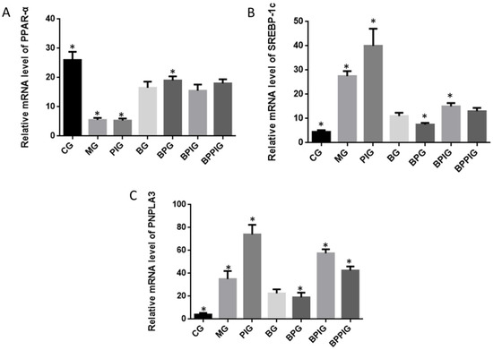 qRT-PCR analysis indicated that the mRNA levels of Srebp-1c and Pnpla-3 were higher in MG, PIG, BPIG and BPPIG than in CG, BG, and BPG (Figure 8) (p < 0.05). Comparatively, the mRNA level of PPAR-α was higher in CG, BG, BPG, BPIG, and BPPIG than in MG and PIG (p < 0.05) (Figure 8). The results suggest that BP increased the mRNA levels of PPAR-α, which reduced the level of SREBP-1c and PNPLA-3. After the treatment of PPAR-α inhibitor, the mRNA level of PPAR-αwas stable but the mRNA levels of SREBP-1c and PNPLA-3 were reduced, suggesting that PPAR-αantagonist reduced the activity of PPAR-α and resulted in the increase of the mRNA levels of SREBP-1c and PNPLA-3. Thus, the results confirmed that blueberry juice can inhibit the progression of NASH by down-regulating SREBP-1c/PNPLA-3 pathway via PPAR-α.