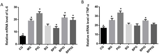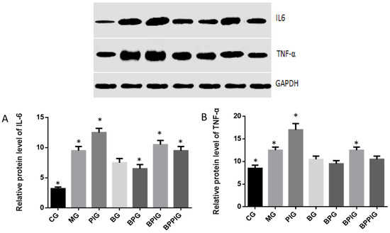 Similar to caspase-3 and Bcl-2, qRT-PCR analysis indicated that the mRNA levels of IL-6 and TNF-α were higher in MG, PIG, BPIG and BPPIG than in CG, BG, and BPG (Figure 10) (p < 0.05). The results suggest that BP treatment will reduce the level of IL-6 and TNF-α. After the treatment of PPAR-α inhibitor, the mRNA level of PPAR-α was stable but the mRNA levels of IL-6 and TNF-α were increased, suggesting that the inhibition of PPAR-α activity will result in the increase of the mRNA levels of IL-6 and TNF-α.
