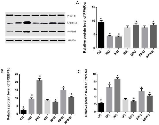 qRT-PCR analysis indicated that the protein levels of SREBP-1c and PNPLA-3 were higher in MG, PIG, BPIG and BPPIG than in CG, BG, and BPG (Figure 11) (p < 0.05). Comparatively, the protein level of PPAR-α was higher in the CG, BG, BPG, BPIG, and BPPIGs than in the MG and PIG groups (p < 0.05) (Figure 11). The results suggest that BP increased the protein levels of PPAR-α while the inhibition of PPAR-α activity will increase the level of SREBP-1c and PNPLA-3. Thus, the results confirmed that blueberry juice can inhibit the progression of NASH by affecting SREBP-1c-PNPLA-3 pathway via PPAR-α.