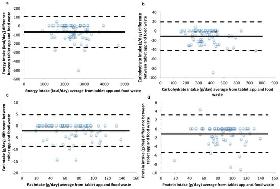 Repeated Measures Bland-Altman plots of the difference between intakes recorded by the tablet app and those from the measured food intake/food waste method against the mean values for the two methods for (a) energy; (b) carbohydrates; (c) fat; and (d) protein. The solid line indicates the mean difference (energy −73 kcal/day, carbohydrates −12 g/day, fat −2.21 g/day and protein −1.25 g/day), and the dashed line indicates the 95% Limits Of Agreement (LOA) (1.96 SD) for nutrient intakes (energy −250 kcal/day, 104 kcal; carbohydrates −43 g/day, 18 g/day; fat −8.91 g/day, 4.5 g/day and protein −5.52 g/day, 3.03 g/day).