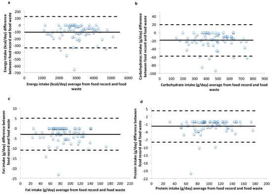 Repeated Measures Bland-Altman plots of the difference between intakes recorded by the wFR and those obtained from the measured food intake/waste method against the mean values for the two methods for (a) energy; (b) carbohydrates; (c) fat; and (d) protein. The solid line indicates the mean difference (energy −108 kcal/day, carbohydrates −19 g/day, fat −3.1 g/day and protein −1.8 g/day) and the dashed line indicates 95% LOA (1.96 SD) for nutrient intakes (energy −338 kcal/day, 122 kcal; carbohydrates −58 g/day, 19 g/day; fat −11 g/day, 5 g/day, and protein −8 g/day, 4.2 g/day).