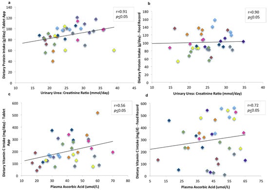 The data showed moderate to good correlations where the urinary urea:creatinine ratio (unadjusted, r = 0.34; adjusted r = 0.91) and the plasma ascorbic acid (unadjusted, r = 0.35; adjusted r = 0.56) were significantly related to dietary intakes using the tablet app (p ≤ 0.05) (Figure 3a,b) after the adjusted values were controlled for age, energy intake, and body mass index.