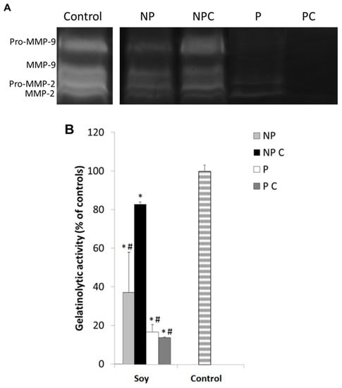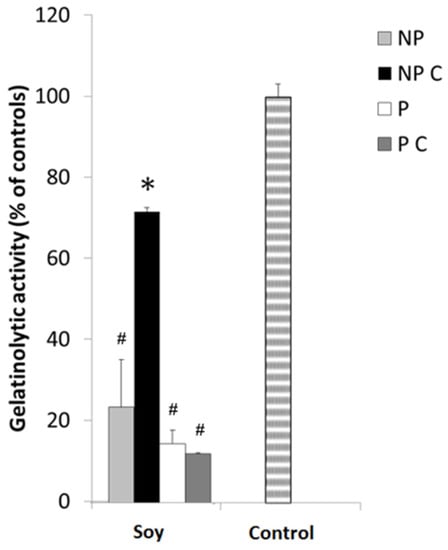 Under normal conditions, cancer cells secrete active MMP-2 and MMP-9 into the extracellular medium and upon degradation of the surrounding environment, they are able to proceed with cell migration [3,80], and consequently with the formation of metastases. The specificity of MMP inhibition may be of significant importance in this matter, because it may maintain low secondary effects and also induce higher efficacy in prevention or treatment. The inhibition of MMP-2 or MMP-9 in the HT29 cells exposed to the different soy extracts was analyzed through zymographic analysis as well as the DQ gelatin assay. Results can be observed in Figure 5A,B.