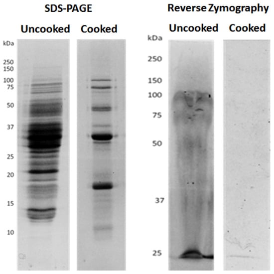It is known that protease inhibitor peptides are stable within reasonable limits, at elevated temperatures, and some proteins of lower molecular weight and some leguminous species also present thermostability, which could be the case of soybean protein fractions [71]. Through reverse zymography, as shown in Figure 2, we could pinpoint which proteins showed a capacity for inhibition or resistance to MMP-9, and which were resistant to cooking. In this technique, proteins are electrophoretically separated in an acrylamid gel co-polymerized with MMP-9 and its substrate gelatin. Hence, after incubation, the gelatin in the gel suffers MMP-9-induced proteolysis, resulting in a clear gel. The observed remaining visible bands represent the proteins which are resistant to or inhibit MMP-9 activity.