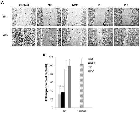 HT29 cell migration after exposure to non-protein uncooked fraction (NP), non-protein cooked fraction (NP C), protein uncooked fraction (P) and protein cooked fraction (P C), as determined by the wound healing assays. (A) Representative images of cell migration showing the inhibitory effect of different fractions of Glycine max seeds on HT29 cell migration. Cells were grown until reaching 80% confluence and the monolayer was scratched with a pipette tip (0 h). Cells were then exposed to 100 µg protein/mL, cooked (P C) and uncooked (P), and to 10 mg non-protein/mL, cooked (NP C) and uncooked (NP) and cell migration was recorded after 48 h; (B) Relative migration rates. Values are the means of at least three replicate experiments ± SD, and are expressed as a percent the wound closure in relation to 0 h. * represents p < 0.05 between samples and # represents p < 0.05 when compared to controls.