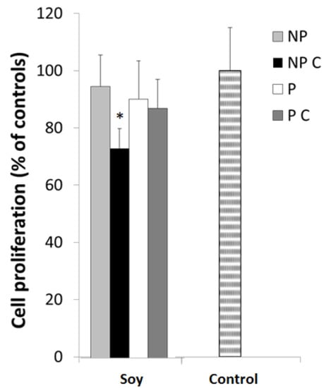 HT29 cultured cells were seeded on 96-well plates (2 × 104 cells/well) and soy extracts were added to the growth media in different concentrations, and incubated for 24 h. After each treatment, the extracellular media was collected, and the wells were washed with PBS to remove unattached cells. Cell proliferation and viability was determined using the standard 3-(4,5-dimethylthiazol-2-yl)-2,5-diphenyltetrazolium bromide (MTT) assay as described by Carmichael et al. [46].
