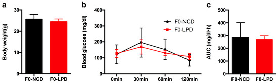 By the end of lactation, there was no significant difference in maternal body weight between the dams (noted as F0) fed with LPD and NCD (Figure 1a). Glucose tolerance testing showed that blood glucose was indistinguishable between the two groups, as well as with the area under the curve (AUC) (Figure 2b,c). There was no significant difference in food intake between dams fed with LPD and NCD.