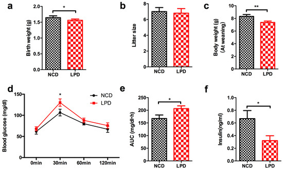 At birth, newborns whose mother was fed with LPD during pregnancy and lactation showed lower body weight compared to offspring of control diet mothers (p < 0.05, Figure 2a). No significant difference was found in litter size between LPD and NCD groups (Figure 2b). At weaning, the male offspring of LPD-fed dams exhibited significantly lower body weight, compared with the offspring of dams fed a control diet (p < 0.05, Figure 2c). There was no difference of fasted blood glucose in the LPD and NCD male offspring at weaning. However, the blood glucose of the male offspring in LPD group was higher at 30 min (p < 0.05) after intraperitoneal glucose administration (Figure 2d). Consistently, the area under the curve (AUC) of the glucose tolerance test was greater in LPD offspring (p < 0.05, Figure 2e). We further examined insulin concentration of the male offspring. As consistent with previous studies [15,29], LPD offspring showed lower fasted insulinemia at weaning, compared to control offspring (Figure 2f), which may be caused by aberrant insulin secretion due to intrauterine growth restriction.