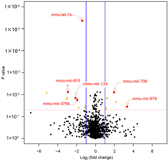 The volcano plot of the miRNA array. This graph shows log2 (fold change) in the expression miRNAs and p value from the t-test between LPD and NCD offspring. The vertical blue line indicates that the threshold of |log2 (fold change)| is 1. The horizontal red line indicates that the p value threshold is 0.05. It showed six miRNAs were significantly differentially expressed (|fold change| ≥ 2 and p value < 0.05) between LPD and NCD offspring. LPD, Low-protein diet; NCD, normal chow diet.