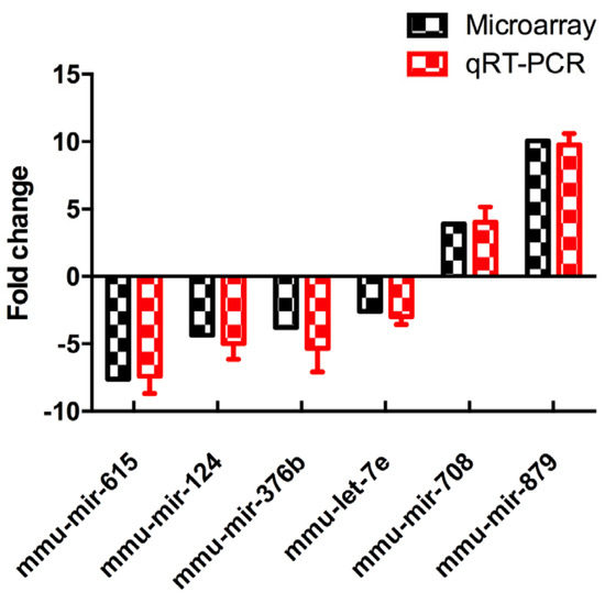 Differentially-expressed miRNAs were detected by miRNA array and validated by qRT-PCR. Data represented as the mean ± SEM (n = 6 to 8, per group). The fold change was calculated using the comparative Ct method. qRT-PCR: quantitative real time-PCR.