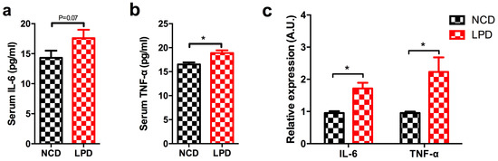 Effect of maternal LPD on serum IL-6 and TNF-α concentrations and mRNA expression in the offspring at weaning. (a) Serum IL-6; (b) serum TNF-α; and (c) IL-6 and TNF-α mRNA expression in the livers of offspring. Data represented as the mean ± SEM (n = 6 to 8, per group). * p < 0.05, vs. the NCD group. LPD, low-protein diet; NCD, normal chow diet; IL-6: interleukin-6; TNF-α: tumor necrosis factor-α.