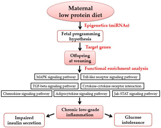 Epidemiological studies and animal experiments have indicated that adverse maternal nutriture influence organ development and metabolism of progeny, which may increase the susceptibility of developing diabetes in later life, and even in the following generation [30,31]. Maternal nutrition has long-term metabolic effects on offspring, which was known as the “fetal programming hypothesis” [32]. Here, our findings demonstrate that the exposure of LPD feeding during pregnancy and lactation resulted in low birth weight, impaired glucose tolerance, and lower insulin secretion in offspring, at as early as weaning age. We also observed that offspring from LPD-fed dams showed perturbation of the programmed expression of some key miRNAs in offspring at weaning. Thus, using microarray profiling, bioinformatics approaches, and functional enrichment analysis, all of the target genes of misexpressed miRNAs were mapped in seven inflammatory-related pathways. Finally, we showed that that serum levels of pro-inflammatory cytokines IL-6 and TNF-α were also increased in offspring from LPD-fed dams. Furthermore, the mRNA expression and protein levels of IL-6 and TNF-α were significantly increased in offspring from maternal LPD feeding. Therefore, these results show that maternal LPD consumption may regulate the expression of miRNAs, which may be associated with chronic inflammation status and glucose intolerance in offspring as early as weaning age (Figure 7).