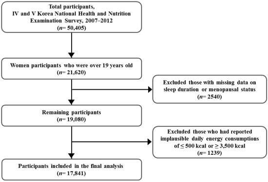 The study was based on data from the KNHANES VI (2007–2009) and V (2010–2012), which is a national representative and cross-sectional survey carried out by the Korea Centers for Disease Control and Prevention (KCDC). The KNHANES was conducted to investigate the health and nutritional status of selective participants from a non-institutionalized civilian Korean population. The survey used a complex and stratified multi-stage probability clustered sampling design and consisted of a health interview, a physical health examination, and a nutritional survey. Detailed information can be found elsewhere []. From a total of 50,405 participants (22,926 men and 27,479 women) in the KNHANES IV–V (2007–2012), 21,620 women over the age of 19 years were selected for this study. Women with missing and inadequate sleep duration (n = 1690) and menopausal status (n = 850) data were excluded. Additionally, women who reported an implausible daily total energy consumption of ≤500 kcal or ≥3500 kcal (n = 1239) were excluded. Finally, 17,841 women were selected for the final analysis (Figure 1). Analysis before and after excluding missing and inadequate data showed no significant differences in sleep duration and energy consumption compared with menopausal status. All participants signed the provided written informed consent, and the survey protocol was approved by the Institutional Review Board of the KCDC.
