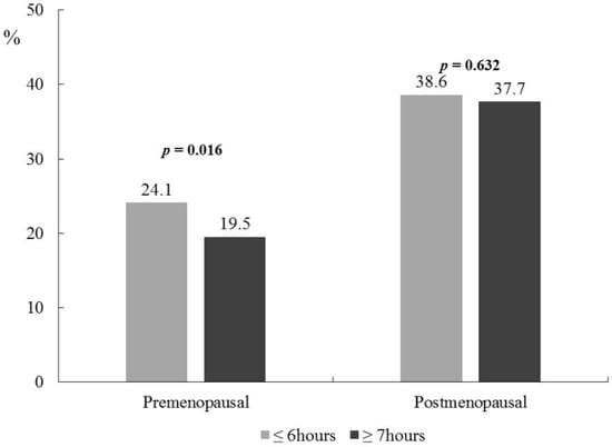 Significant differences in obesity-related variables and BP by sleep duration were observed in premenopausal women after adjustment for age, education level, monthly household income, hypertension, cardiovascular disease, diabetes, smoking status, alcohol drinking, and physical activity (Table 3). Premenopausal women with short sleep duration had significantly higher body weight (58.09 ± 0.22 kg vs. 57.04 ± 0.15 kg, p = 0.007) and BMI (22.96 ± 0.08 kg/m2 vs. 22.39 ± 0.06 kg/m2, p = 0.003) compared with those with adequate sleep duration after adjustment for the covariates. Moreover, SBP (109.68 ± 0.28 mmHg vs. 107.76 ± 0.21 mmHg, p = 0.028) and DBP (72.54 ± 0.21 mmHg vs. 71.26 ± 0.16 mmHg, p = 0.024) were higher among premenopausal women with short sleep duration compared with those with adequate sleep duration. All anthropometric and blood biochemical variables by sleep duration were not significantly different for postmenopausal women, except for HDL-C (p = 0.005). Significant interactions between menopausal status and sleep duration were observed for body weight, BMI, SBP, DBP, TC, and HDL-C (p-interaction < 0.001 for all), WC (p-interaction = 0.008), and TG (p-interaction = 0.015). The prevalence of obesity according to sleep duration was significantly different only for premenopausal women and not for postmenopausal women; premenopausal women with short sleep duration showed a higher proportion with obesity after adjustment for the covariates (24.1% vs. 19.5%, p = 0.016, Figure 2).